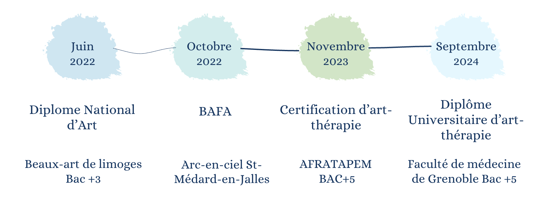 Intéressée par l’art depuis l’enfance j’ai exercé de nombreuses pratiques artistiques : danse, poterie, musique, théâtre, chant. Par la suite, j’ai élargi mon champ de compétences en étudiant aux Beaux-Arts jusqu’au niveau licence. Par la suite j’ai passé mon BAFA et j’ai démarré une formation d’art-thérapie moderne à L’AFRATAPEM. Après l’obtention de ma certification d’art-thérapeute, j’ai finalisé mon parcours par un diplôme universitaire d’art-thérapie à la faculté de médecine de Grenoble.